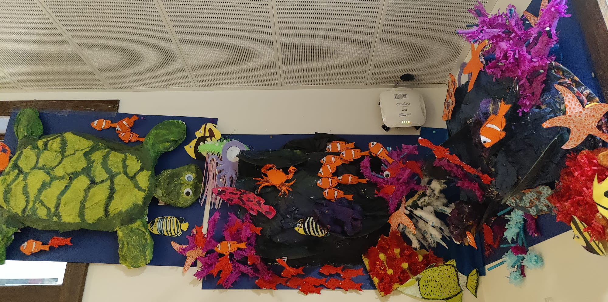 La classe de S4geoFRd a fait un projet sur les récifs coralliens. Les élèves ont étudié les récifs et ont ensuite réalisé un récif corallien dans le couloir d’Aristote au 1er étage.